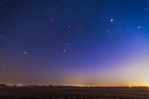 Orion and winter stars setting into the western sky in spring, northern hemisphere, with the blue glow of twilight still in the sky and the yellow glow of urban light pollution at right. Taken with Canon 5D MkII and 24mm lens, tracked for stack of 3 x 1 minute exposures at f/2.8 and ISO 1000.