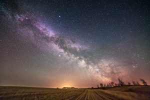 The summer Milky Way rising late on a spring night over a fallow wheatfield in spring, 2013. Taken from home, May 6, 2013, with the Canon 5D MkII and Samyang 14mm lens at f/2.8 for a stack of 5 x 2.5 minute exposures at ISO 1600, all tracked on the iOptron Sky-Tracker. The ground is from one exposure. Taken from a latitude of +50° so Scorpius at right and Sagittarius right of centre are skimming the southern horizon.