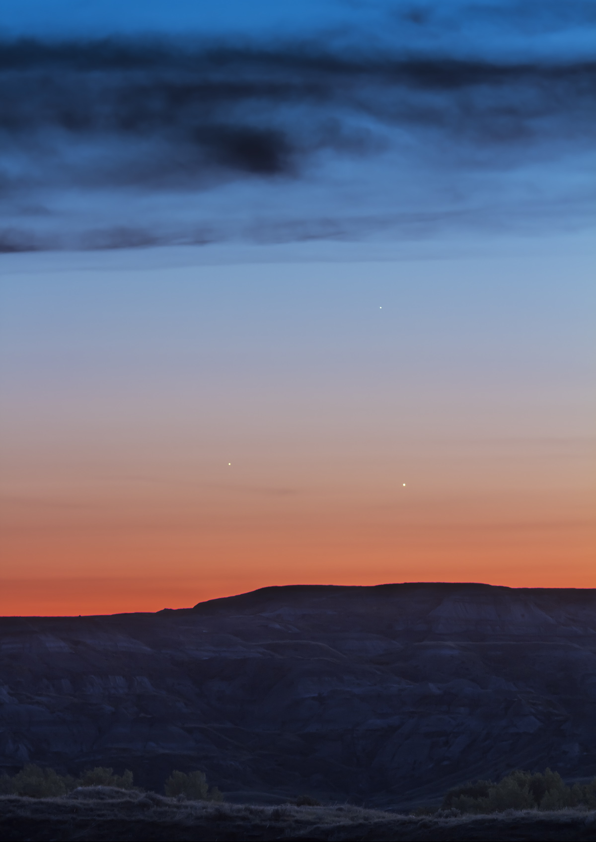 This was the triple-planet conjunction last night, Sunday, May 26, as seen from the badlands of Dinosaur Provincial Park, Alberta. I headed  there, a 90-minute drive east from home, to conduct a night of time-lapse shooting, and to catch the planets low in the western twilight far away from thick clouds that tend to hug the horizon over the mountains.