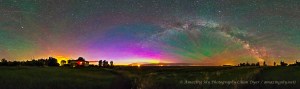 A 360° horizon Panorama taken from home June 5, 2013, showing the Milky Way, a low aurora to the north, perpetual twilight glow to the north (left of centre) and bands of green airglow across the sky. Left of the house and also left of the main area of Milky Way are horizon glows from urban light pollution. A satellite, the ESA Einstein ATV going to the ISS, is at left of frame.