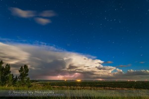 A thunderstorm moving across the northern horizon, lit by moonlight, and with the stars of Cassiopeia, Andromeda and Perseus rising. Shot June 25, 2013, using Canon 5D MkII at ISO 200 and 24mm lens at f/5 for 3 minute exposure. Shot from home.