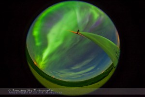 A frame from a 300-frame time-lapse taken June 28, 2013 during an all-sky aurora display seen widely over North America. This was taken from the Wintering Hills Wind Farm on Highway 56 south of Drumheller, Alberta. It is a 25-second exposure at f/3.5 with the 8mm Sigma lens and Canon 5D MkII at ISO 1600. The waning quarter Moon is just rising at left, with the auroral sub-storm beginning to peak.
