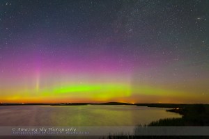 A faint aurora that brightened slightly for a few minutes and gained some structure. Shot over Crawling Lake reservoir, near Bassano, Alberta. This is a 30-second exposure at f/2.5 with the 24mm lens and Canon 5D MkII at ISO 1600.