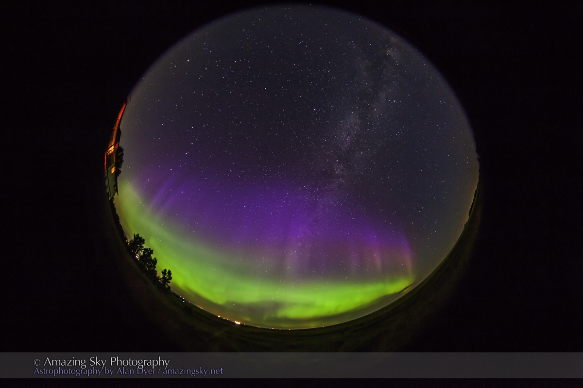 This fish-eye shot of the entire sky shows the high purple curtains arching up the sky. Over several minutes they separated and ascended away from the main green band, shooting up the sky. It seemed as if they were their own curtains and not just a different coloration fringing the main display.