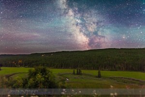 The Milky Way in Sagittarius over the Battle Creek valley in Cypress Hills Interprovincial Park, on the Alberta side, July 14, 2013. Taken as part of a 270-frame dolly time-lapse sequence. Bands of airglow tint the sky in streaks of green and red. This is a single 30-second untracked exposure at f/2 with the 24mm lens and Canon 5D MkII at ISO 3200.