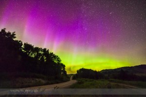 The Northern Lights from Cypress Hills Interprovincial Park, Alberta, July 14/15, 2013. This was not a bright display but the camera picked up nice colours. This is a single frame from a time-lapse sequence, with the Canon 5D MkII at ISO 3200 and 14mm lens at f/2.8 for 30 seconds.