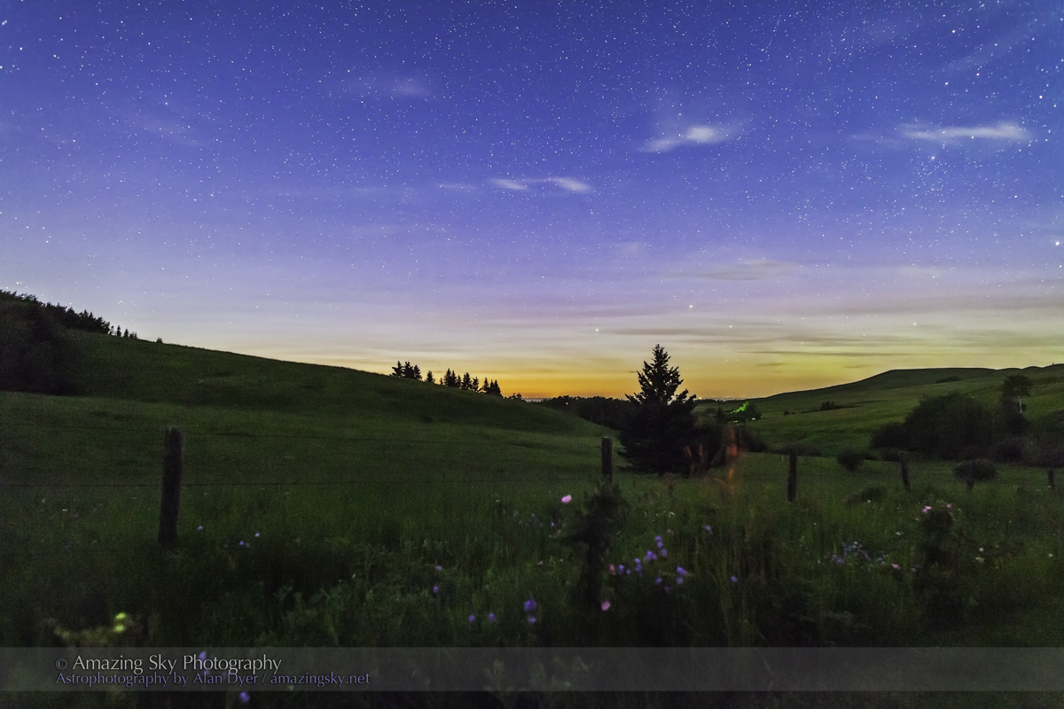 Last night was another good one on the Ranch! I had three cameras shooting from my log cabin front yard – I had no ambition to travel farther afield this night, after 6 nights in a row of shooting around the Cypress Hills. This is a scene from one of the time-lapses taken from “home,” of prairie flowers in front of a prairie sky.