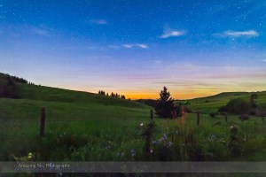 A starlit scene on the Reesor Ranch, Alberta, with pink Wild Roses and bluebells by the road with a starry sky behind in the twilight, July 16, 2013. This is one frame of a 300 frame time-lapse dolly sequence. This is 20 seconds at f/2.8 with the 24mm lens and Canon 5D MkII at ISO 3200. Capella is the bright star above the horizon.
