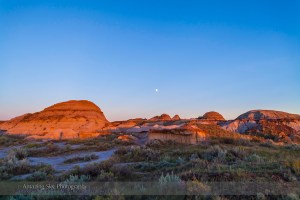 The setting Sun illuminates the badlands at Dinosaur Provincial Park, Alberta, as the waxing gibbous Moon rises into the southeast sky. Taken August 18, 2013 as part of a 450-frame time-lapse, as frame #1 at the start of a sequence. Taken with the 24mm lens and Canon 5D MkII.