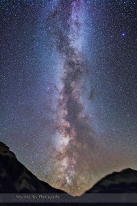 The Milky Way from northern Sagittarius to southern Cygnus, above the mountains of Waterton Lakes National Park; Alberta, Aug 31, 2013. This is a stack of 4 x 3 minute exposures at f/2.8 with the 24mm lens and Canon 5D MkII at ISO 1600.