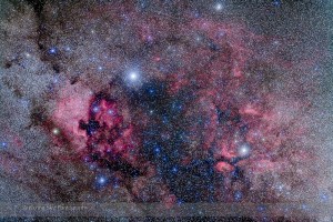 Nebulosity in the heart of Cygnus the Swan, including the North America Nebula and Pelican Nebula at left (NGC 7000 and IC 5070) and Gamma Cygni complex at right (IC 1318). The Crescent Nebula (NGC 6888) is at lower right. This is a stack of 5 x 4 minute exposures at f/2 with the 135mm lens and modified Canon 5D MkII at ISO 800, plus another three similar exposure images but taken thru the Kenko Softon filter for the star glows. Taken from home Sept 10, 2013.