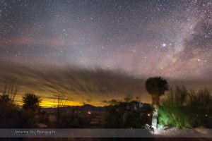 Light pollution from Douglas, Arizona lights the undersides of orographic clouds over the Chiricahua Mountains, competing with the subtle glow of Zodiacal Light (at left) and the Milky Way (at right) in the clear sky to the west above the clouds. A small footlight illuminates the cactus. Taken from the Painted Pony Resort in New Mexico, north of Rodeo, December 4, 2013.