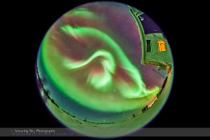 The aurora of February 3-4, 2014 seen from Churchill, Manitoba at the Churchill Northern Studies Centre, in an all-sky view with the 8mm fish-eye lens. This is a 20-second exposure at f/3.5 and ISO 3200 wth the Canon 5D MkII.