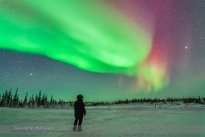 The aurora of February 3-4, 2014 seen from Churchill, Manitoba at the Churchill Northern Studies Centre. I posed for my self-portrait under the stars and Northern Lights. This is a 30-second exposure at f/2.8 with the 24mm lens and ISO 2000 wth the Canon 5D MkII. Vega is setting at left, Arcturus is rising at right.