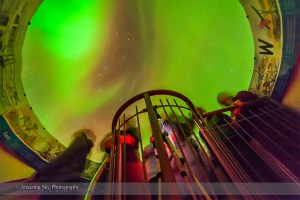 The aurora of February 3-4, 2014 seen from Churchill, Manitoba at the Churchill Northern Studies Centre, in a view taken from inside the building looking up through the plexi “aurora dome,” a warm way to watch the aurora. This is a 30-second exposure at f/2.8 with the 14mm lens and ISO 3200 wth the Canon 5D MkII.