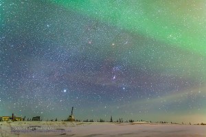 Orion, with Sirius and Aldebaran, above the abandoned launch sites of the Churchill Rocket Range near the Churchill Northern Studies Centre, Churchill, Manitoba. An aurora is visible at top. Taken Feb 3-4, 2014. 30 second exposure at f/2.2 with the 24mm lens and Canon 5D MkII at ISO 3200.