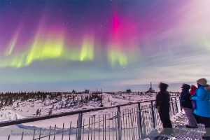 The aurora of February 7, 2014 seen from Churchill, Manitoba at the Churchill Northern Studies Centre, in a view looking southeast over the abandoned Churchill Rocket Range, with the 10-22mm lens. This is taken from the second floor viewing deck at the CNSC. This is a 15-second exposure at f/3.5 and ISO 1600 wth the Canon 60Da camera. Jupiter and Gemini are at top and Orion at lower right. The gibbous Moon is just off the frame at upper right.