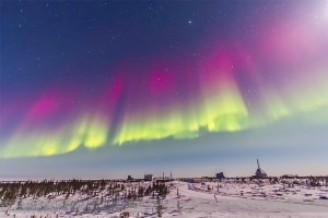 The aurora of February 7, 2014 seen from Churchill, Manitoba at the Churchill Northern Studies Centre, in a view looking south over the abandoned Churchill Rocket Range, with the 10-22mm lens. This is a 15-second exposure at f/3.5 and ISO 1600 wth the Canon 60Da camera. Jupiter and Gemini are at top and Orion at lower right. The gibbous Moon is just off the frame at upper right.