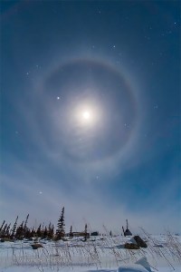An ice crystal halo around the waxing gibbous Moon, Feb 9, 2014, taken from the site of the abandoned Churchill Rocket Range, in Churchill Manitoba. Jupiter is the bright object left of the Moon. Orion is below the Moon, and the field takes in the Winter Hexagon stars from Sirius at lower left to Capella at upper right. This is a 5-second exposure at f/4 with the Canon 10-22mm lens and Canon 60Da at ISO 800.