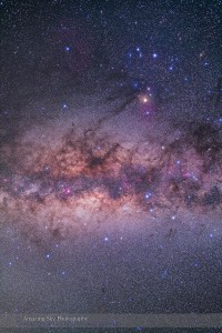 This is a stack of 4 x 6 minute exposures at f/2.8 with the Canon 35mm L-Series prime lens at filter-modified Canon 5D Mark II at ISO 800, plus a stack of two shots, same exposures, taken through the Kenko Softon filter for the star glows. Taken from Coonabarabran, NSW, Australia, April 2014. Area was in the east with some sky gradients.
