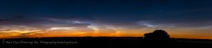 A display of noctilucent clouds, or polar mesospheric clouds, on summer solstice night, June 21-22, 2014 from home in southern Alberta. The is a 5-section panorama with each segment a 13-second exposure at f/5/6 with the 28-105mm lens at 65mm and Canon 60Da at ISO 800. Stitched in PTGui.