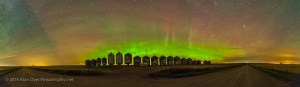 A 180° panorama of a modest aurora display behind grain bins on an Alberta country road. The aurora adds more color to a sky also filled with green airglow, while at the ends of the roads are yellow glows of light pollution, from Strathmore and Calgary at left, and Bassano at right. For a few minutes there was also the sharp edge at left to the aurora rays, present in 3 frames of the panorama, so it is not an artifact of the stitching. The Big Dipper is left of centre, low in the north.