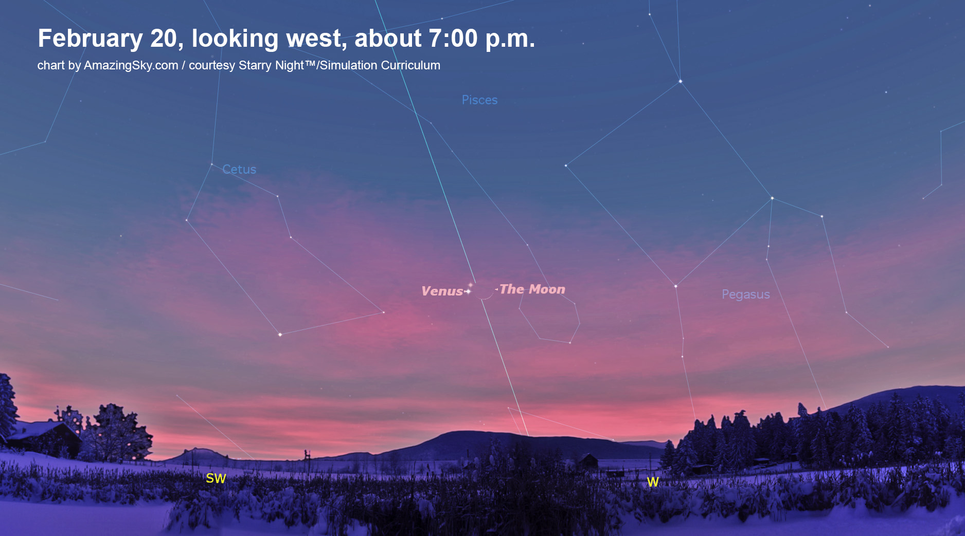 The next night, February 21, the crescent Moon will sit above the Venus-Mars pair. But the two planets will be even closer together, just 1/2 degree apart. They will be a little farther apart on February 22.