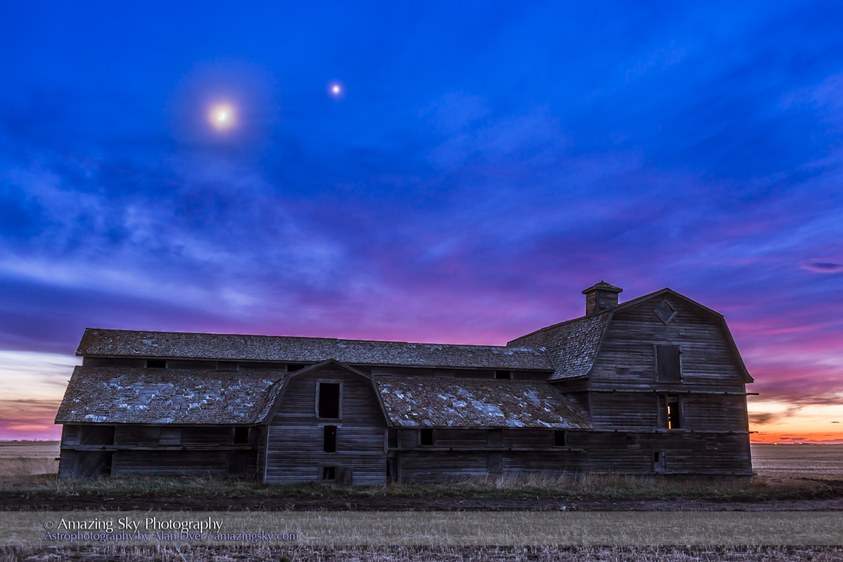 The Moon and Venus shine in conjunction over an old pioneer barn.