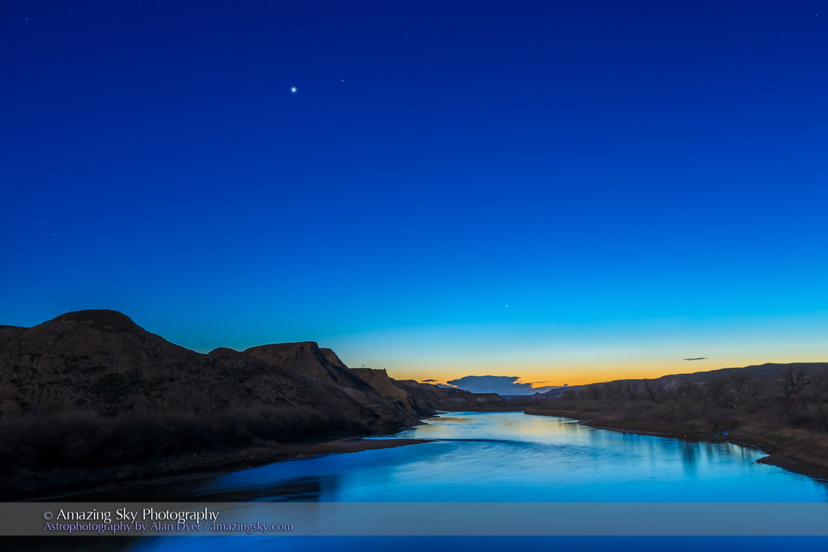 Mercury and Venus shine as “evening stars” over the Red Deer River in southern Alberta.