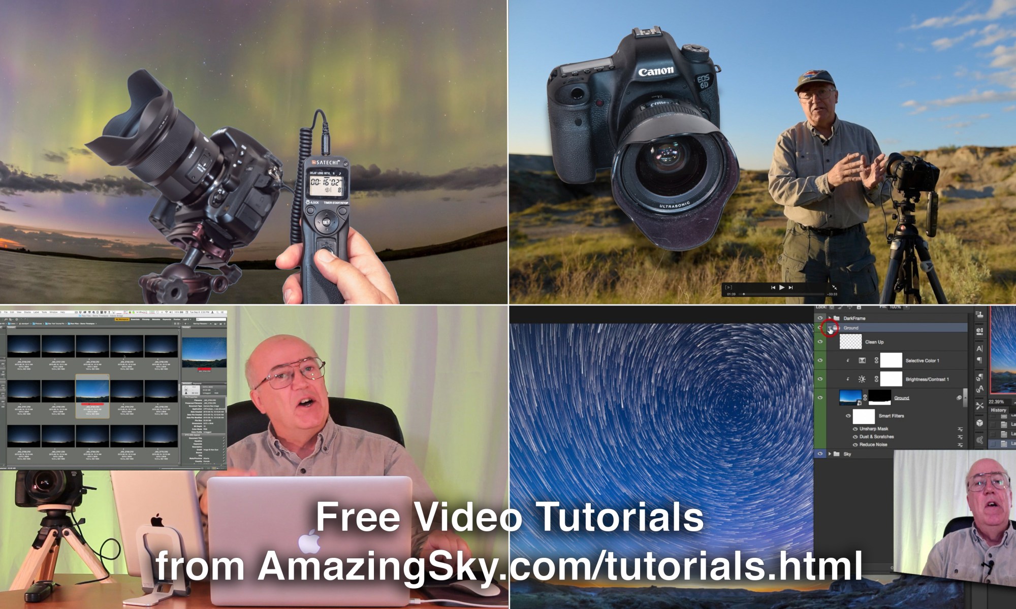 This 35-minute tutorial takes you from a shoot at summer solstice at Dinosaur Provincial Park, then through the steps for stacking star trail stills and assembling star trail time-lapse movies, using specialized programs such as StarStaX and the Advanced Stacker Plus actions for Photoshop.