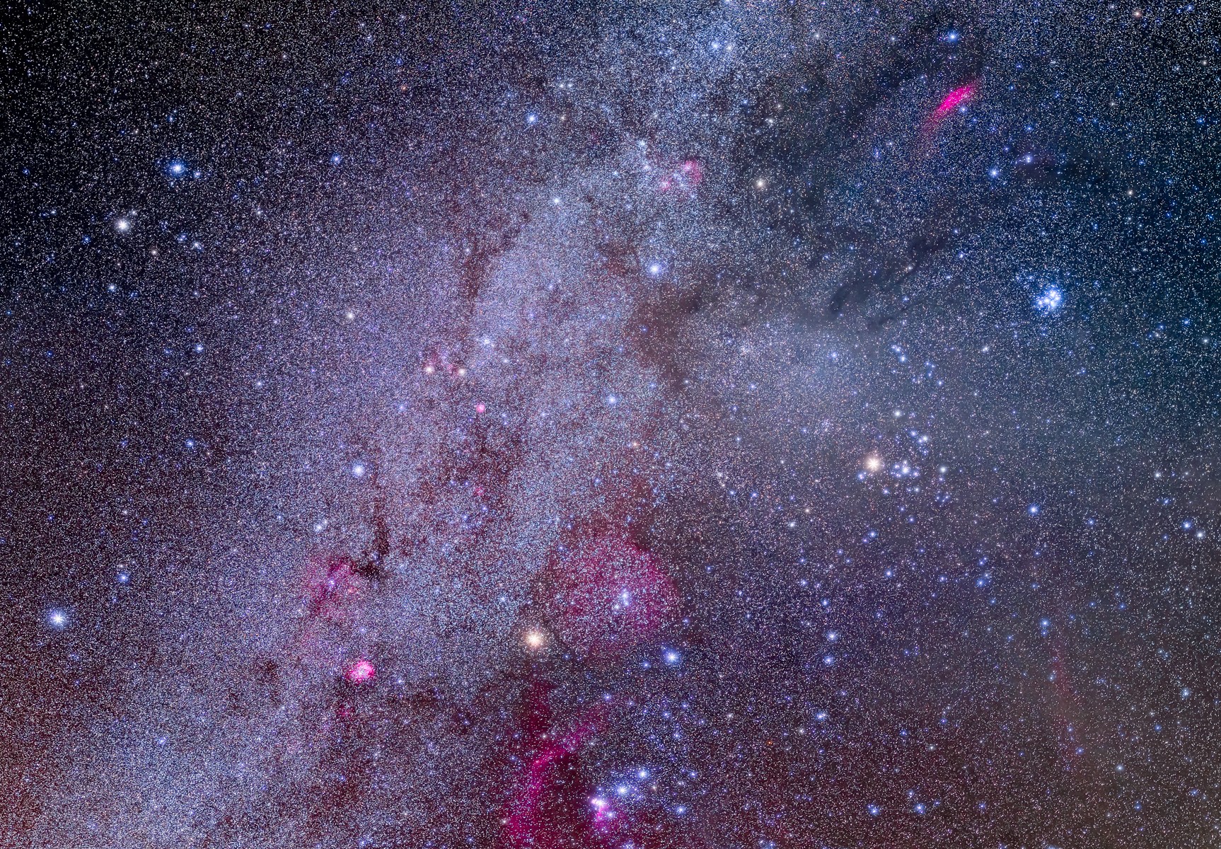 The Milky Way extends from Perseus in the north at top, to Canis Major in the south at bottom. Throughout the scene are dark lanes and dust clouds, such as the Taurus Dark Clouds at upper right.