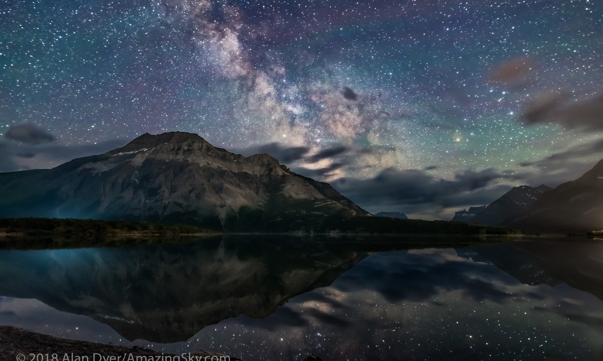 As the sky slowly darkened and the Moon set, the Milky Way appeared arching across the east and down into the south. The sky was never “astronomically dark,” but even with perpetual twilight illuminating the sky, the Milky Way still made a superb subject, especially this night with it reflected in the calm waters on this unusually windless night for Waterton.