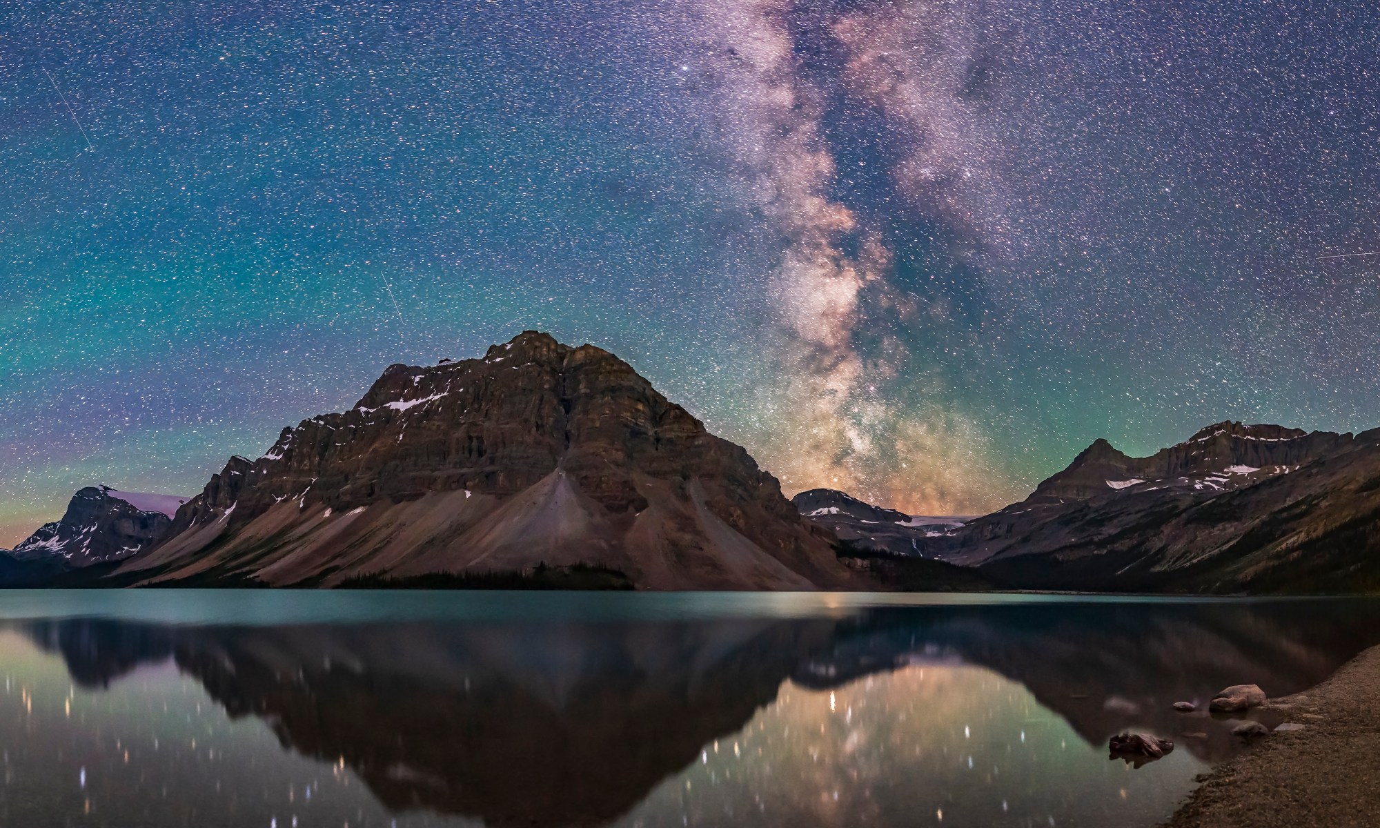The next night, July 16, was one of the most perfect I had ever seen in the Rockies. Crystal clear skies, calm winds, and great lake reflections made for a picture-perfect night at Bow Lake on the Icefields Parkway. Above is a 360° panorama shot toward the end of the night when the galactic centre of the Milky Way was over Bow Glacier.