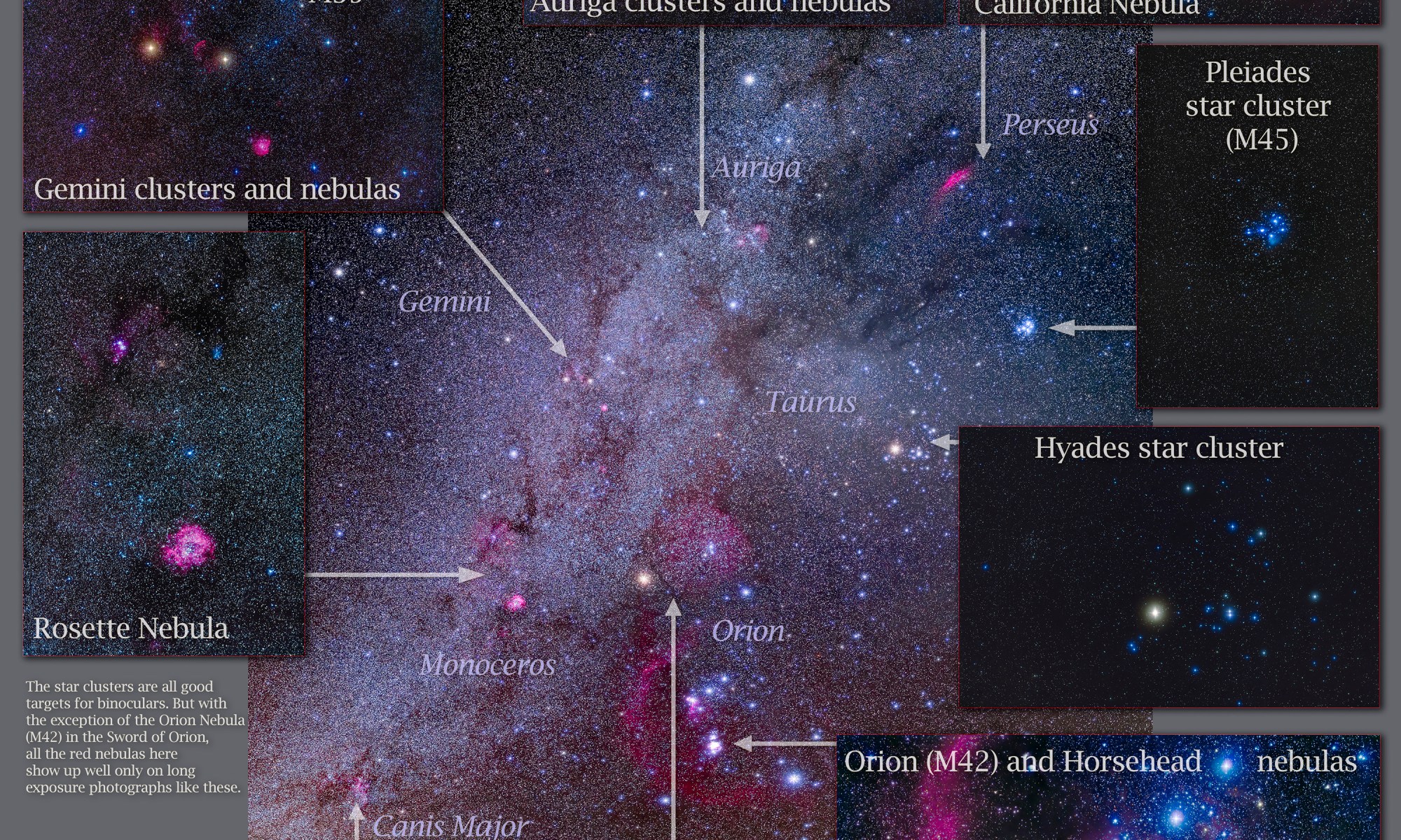 These star forming areas create a panorama of star clusters and glowing nebulas along the winter Milky Way and surrounding the constellation of Orion. The montage above shows the best of the deep-sky sights at this time or year.