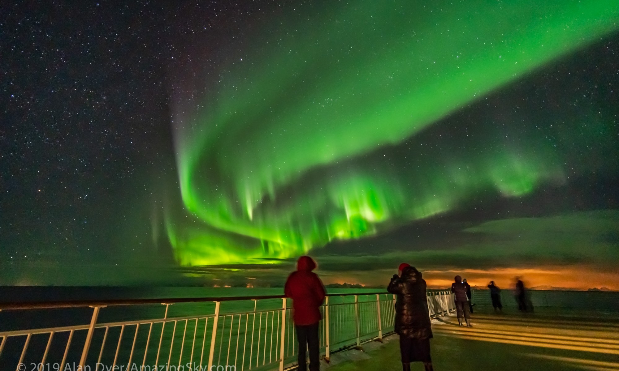 Aurora photographers and observers on the rear deck 9 area of the Hurtigruten ferry ship the ms Trollfjord on the southbound voyage along the Norwegian coast, on March 2, 2019. This is a single 1.6-second exposure at f/2 with the 15mm Venus Optics lens and Sony a7III at ISO 6400.