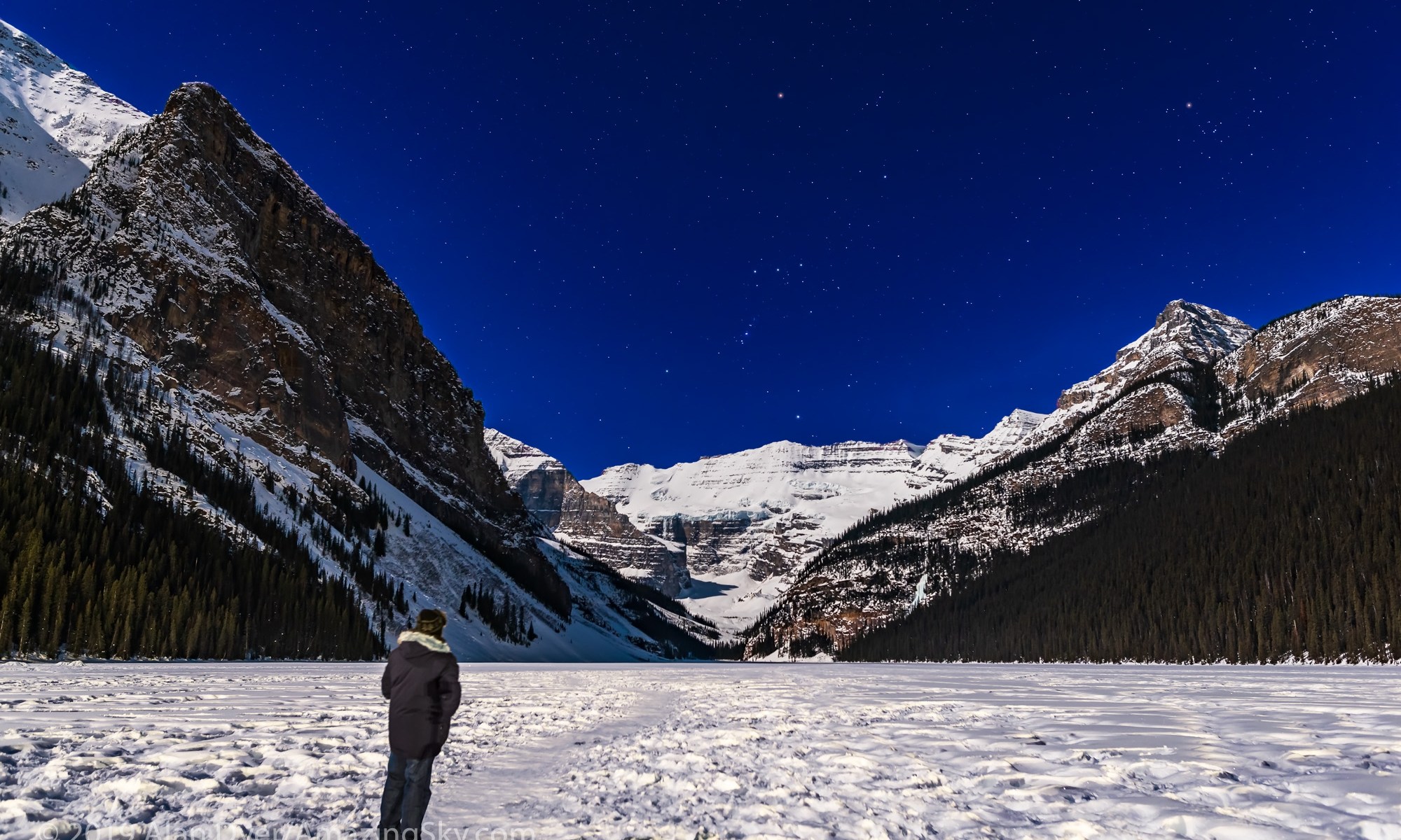 A panorama of Lake Louise in winter, in Banff National Park, Alberta, taken under the light of the waxing gibbous Moon, off frame here to the left. This was March 19, 2019. This is a crop from the original 16-segment panorama, each segment with the 24mm Sigma Art lens and Nikon D750, oriented “portrait.” Each segment was 8 seconds at f/3.2 and ISO 800.