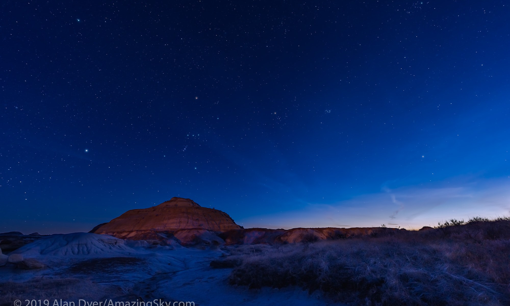 Last Friday night, March 29, I spent the evening at one of my favourite nightscape sites, Dinosaur Provincial Park, about an hour’s drive east of my home. It was one of those magical nights – clear, mild, dry, and no mosquitoes! Yet!