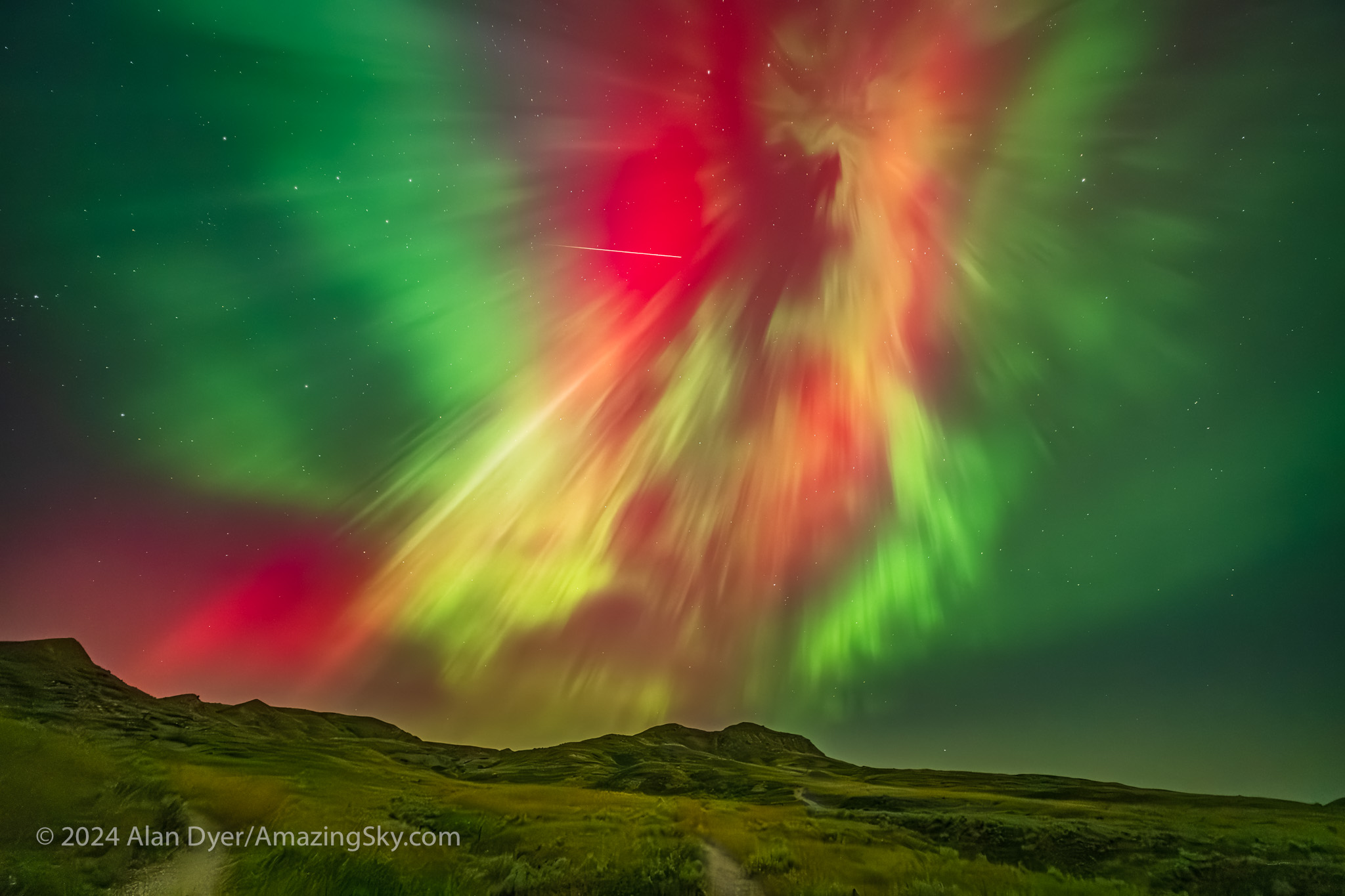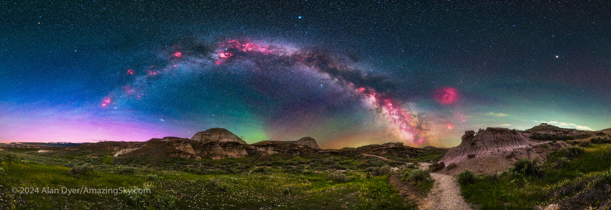 The sky took a break from presenting spectacles, allowing me to head off on short local trips, to favourite nightscape sites in southern Alberta, which we have in abundance. The Badlands of Dinosaur Provincial Park are just an hour away, the site for the scene above.