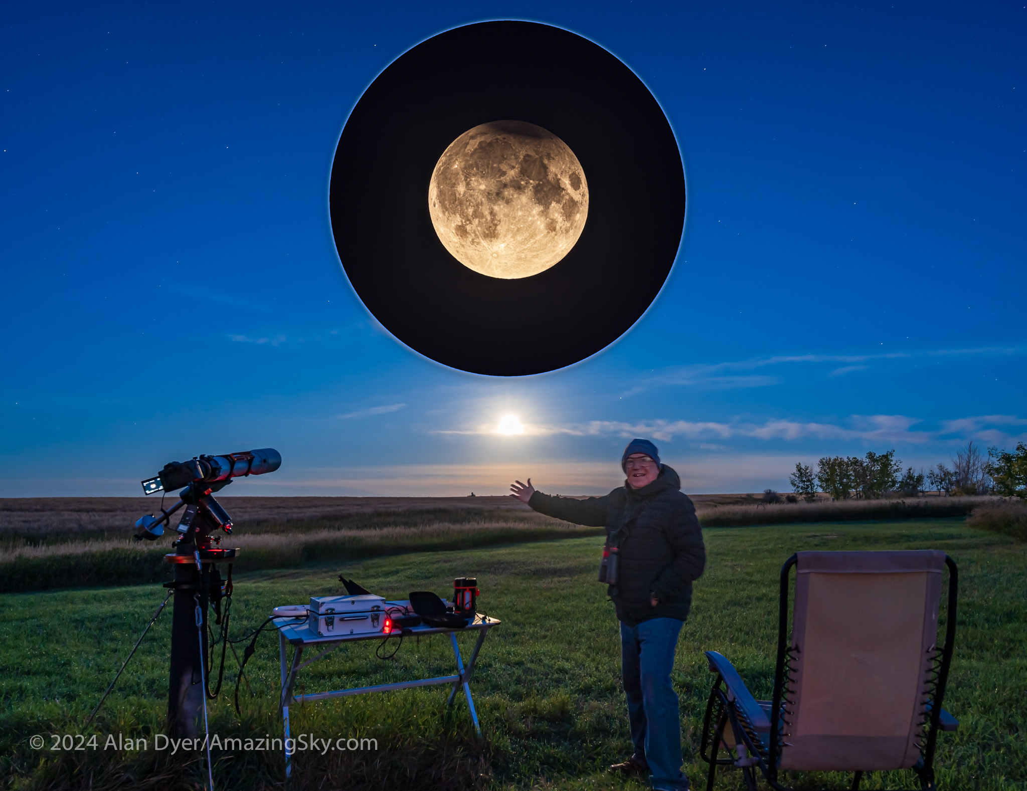On September 17, we had our second eclipse of the Moon in 2024. This time the Earth’s umbral shadow managed to take a tiny bite out of the Full Moon. Nothing spectacular to be sure. But at least this eclipse expedition was to no farther away than my rural backyard. A clear eclipse of any kind, even a partial eclipse, especially one seen from home, is reason to celebrate. I did!