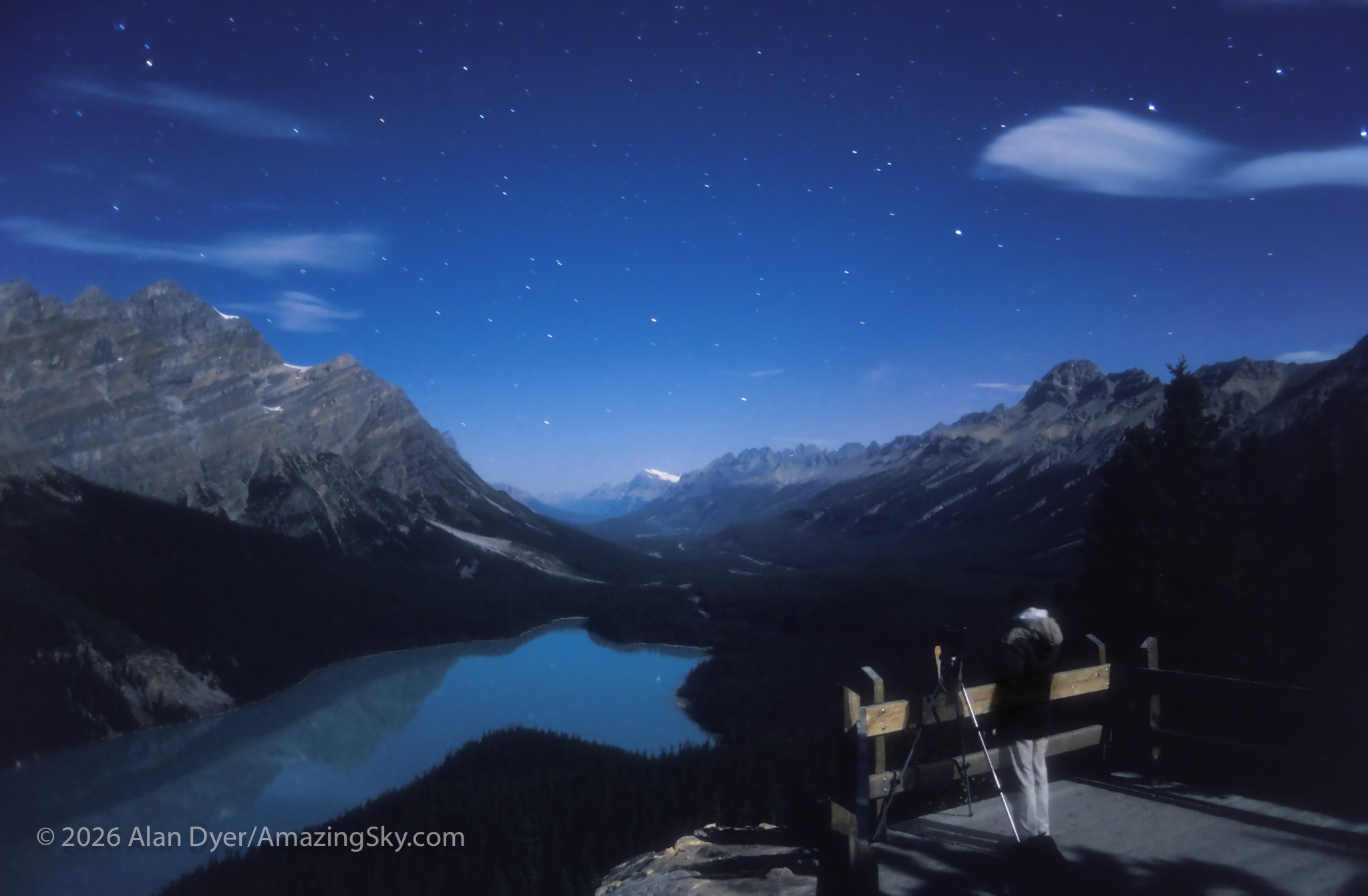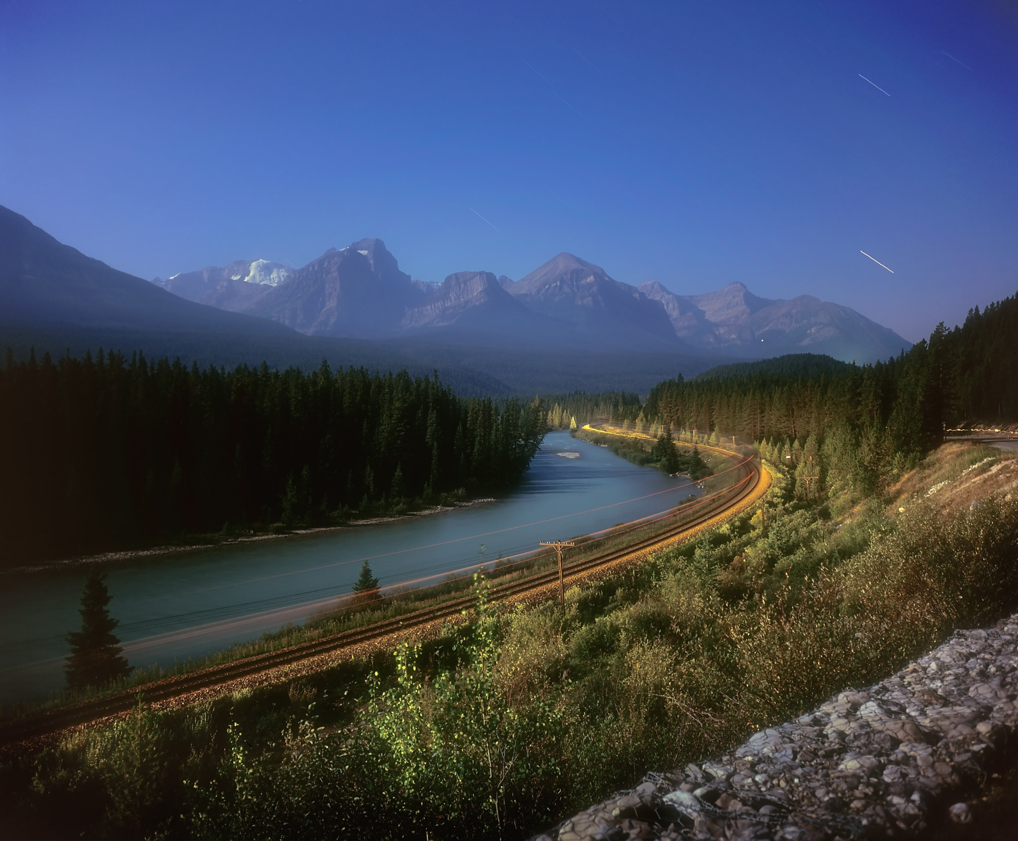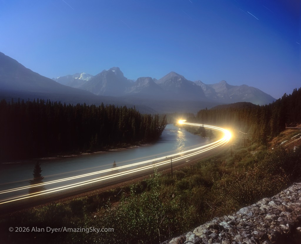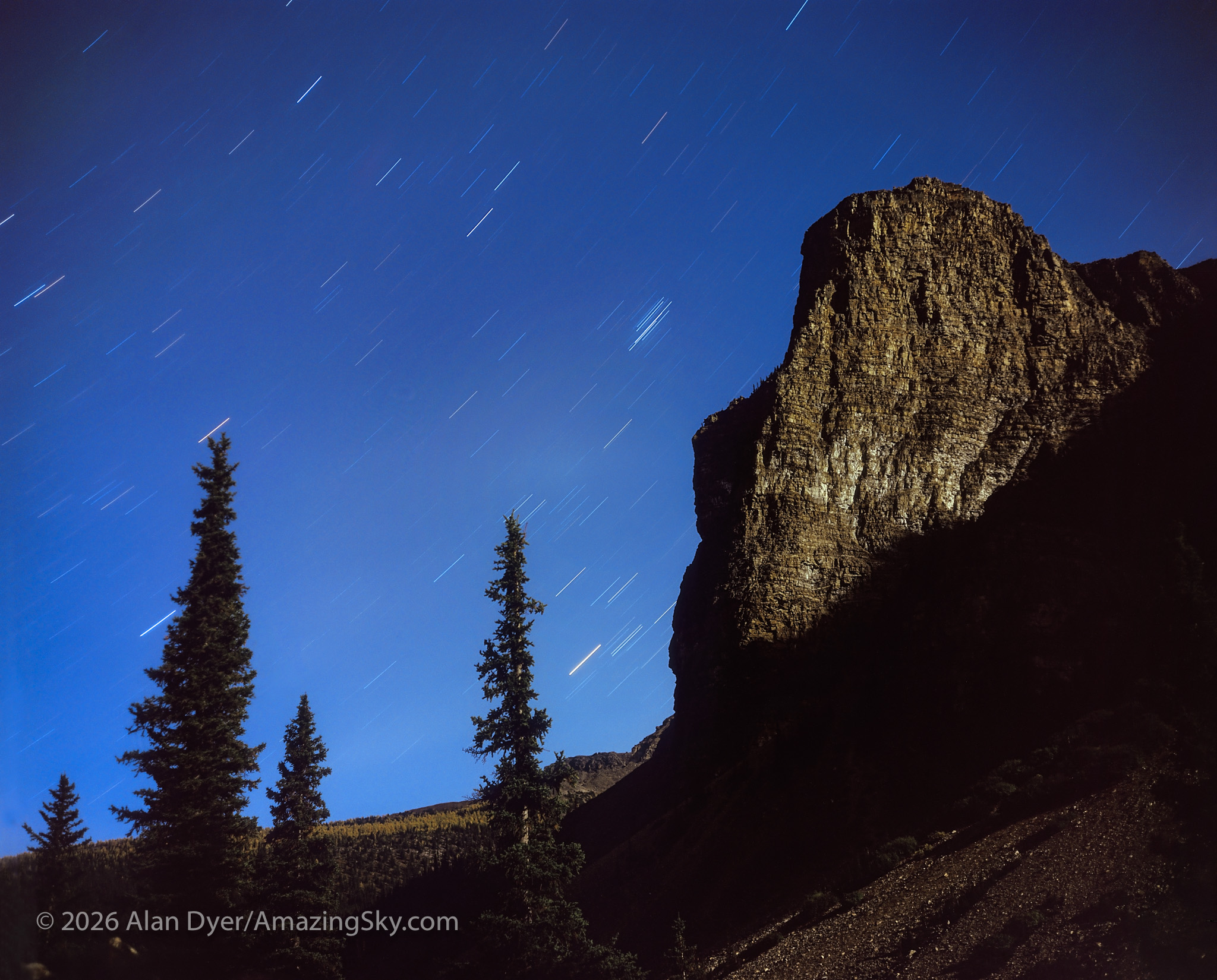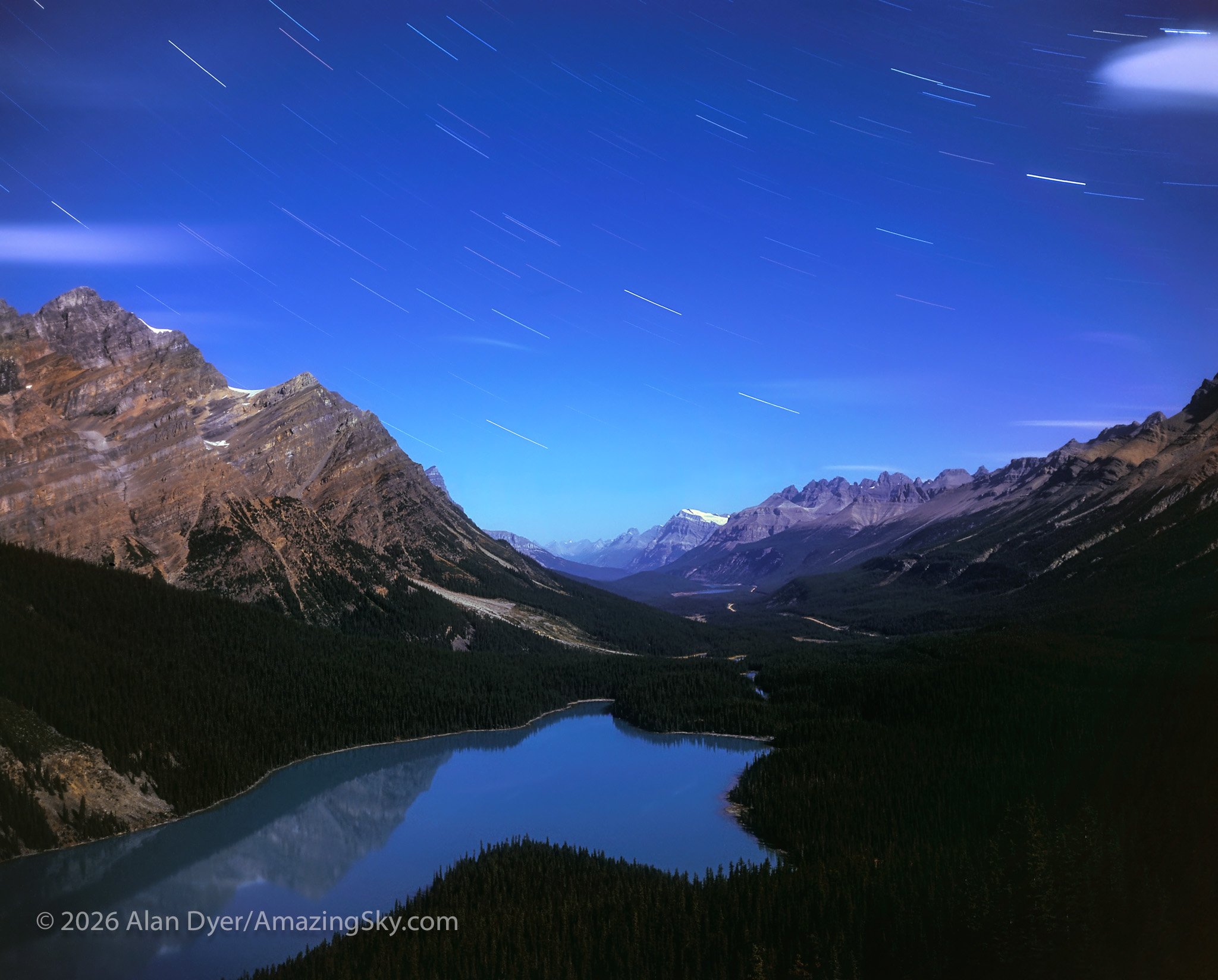 So instead I generally sought out sites in the scenic Canadian Rockies to shoot long exposures by moonlight, as I am doing above at Peyto Lake, to create star trail nightscapes. Exposures were typically 15 to 30 minutes but on slow film. That’s one single exposure on one piece of film. Stacking short exposures? Not in the good old days!
