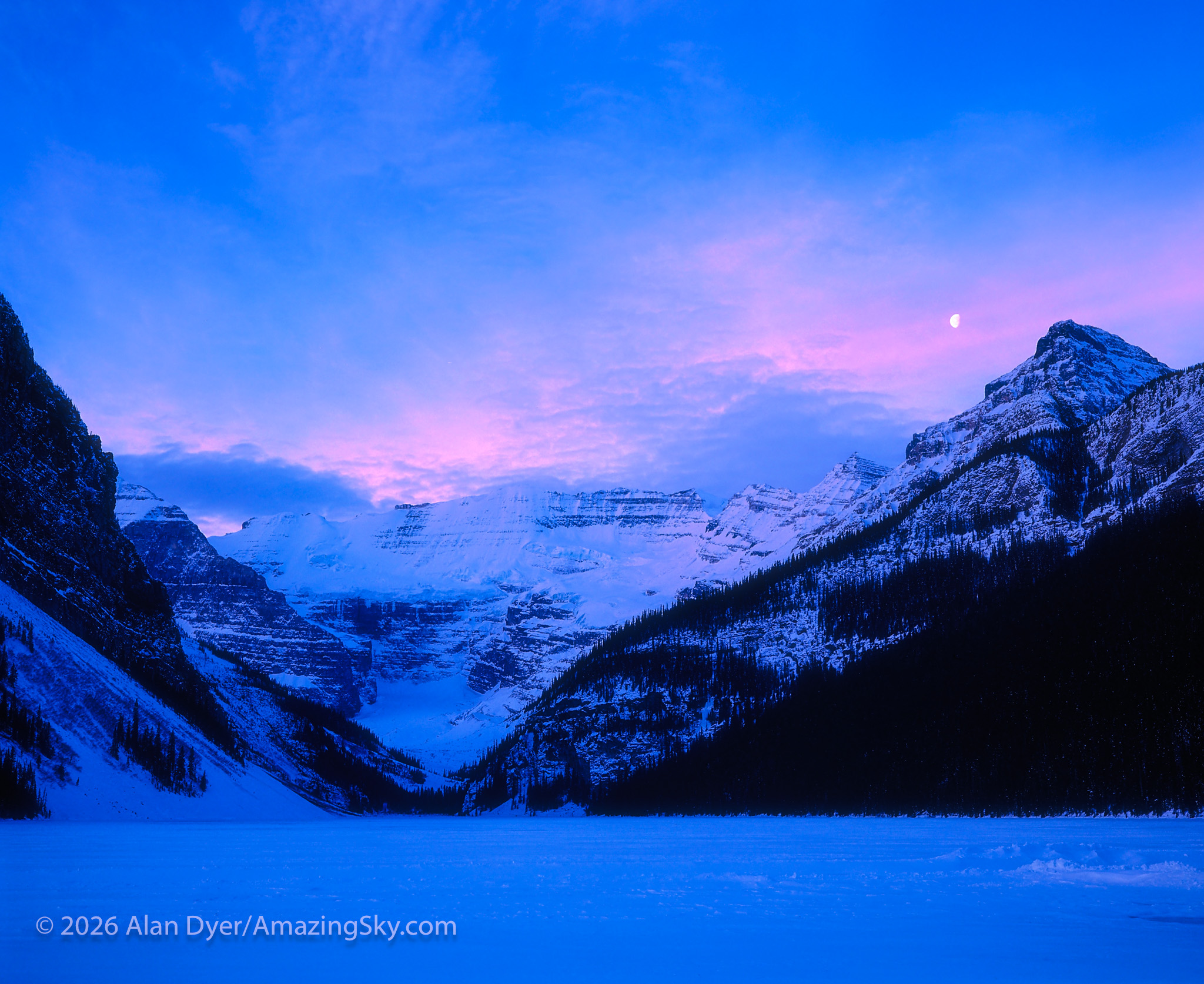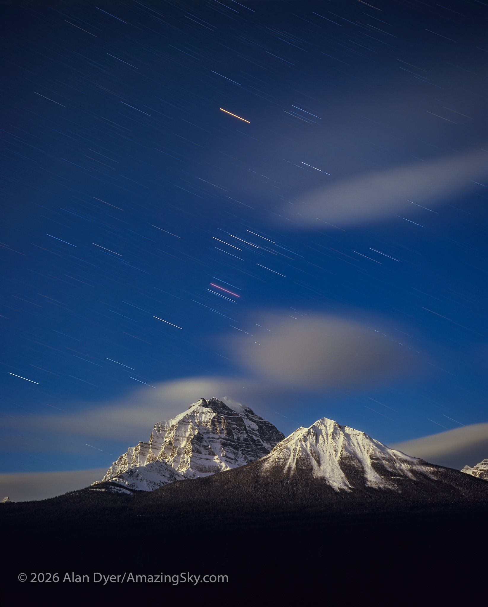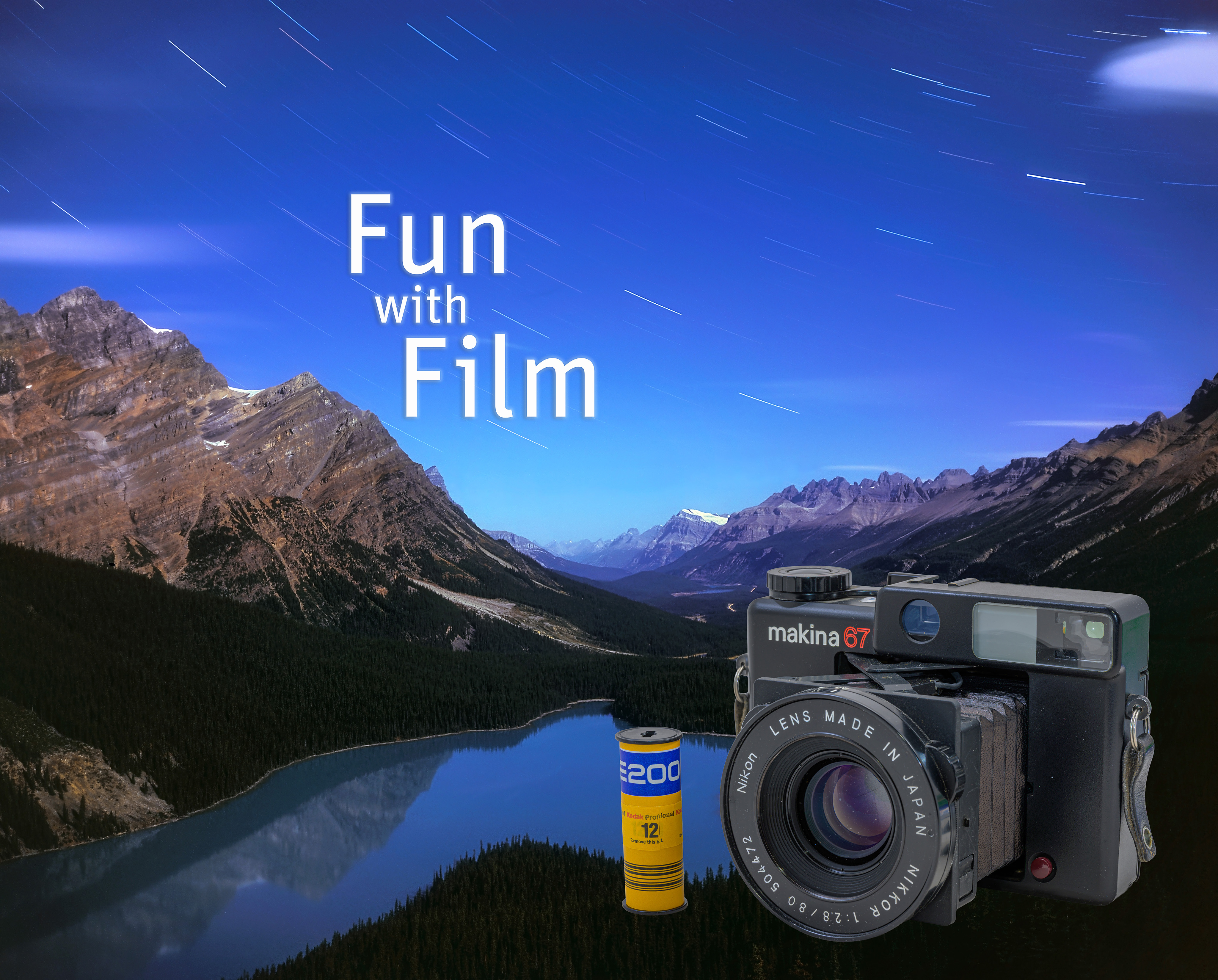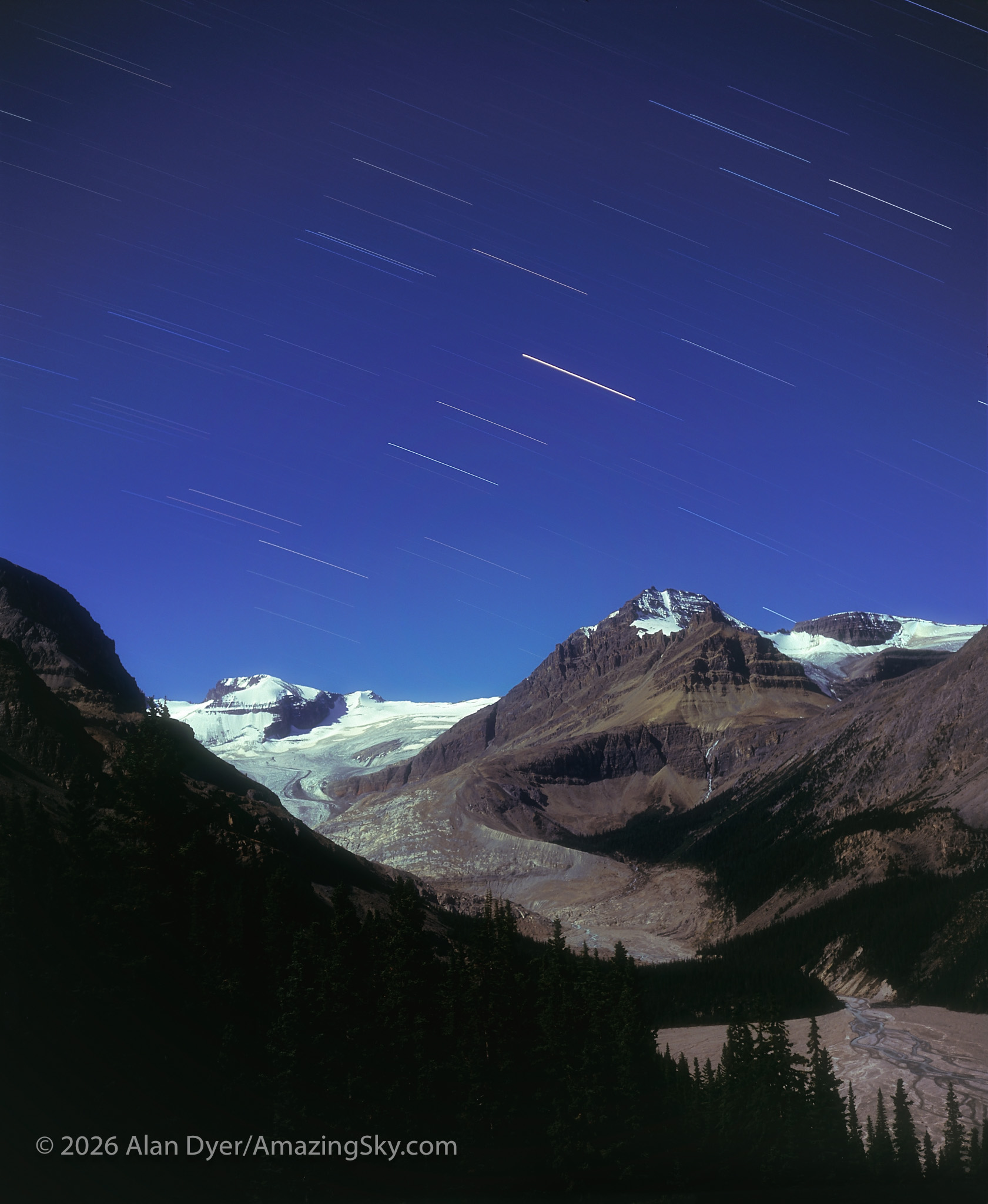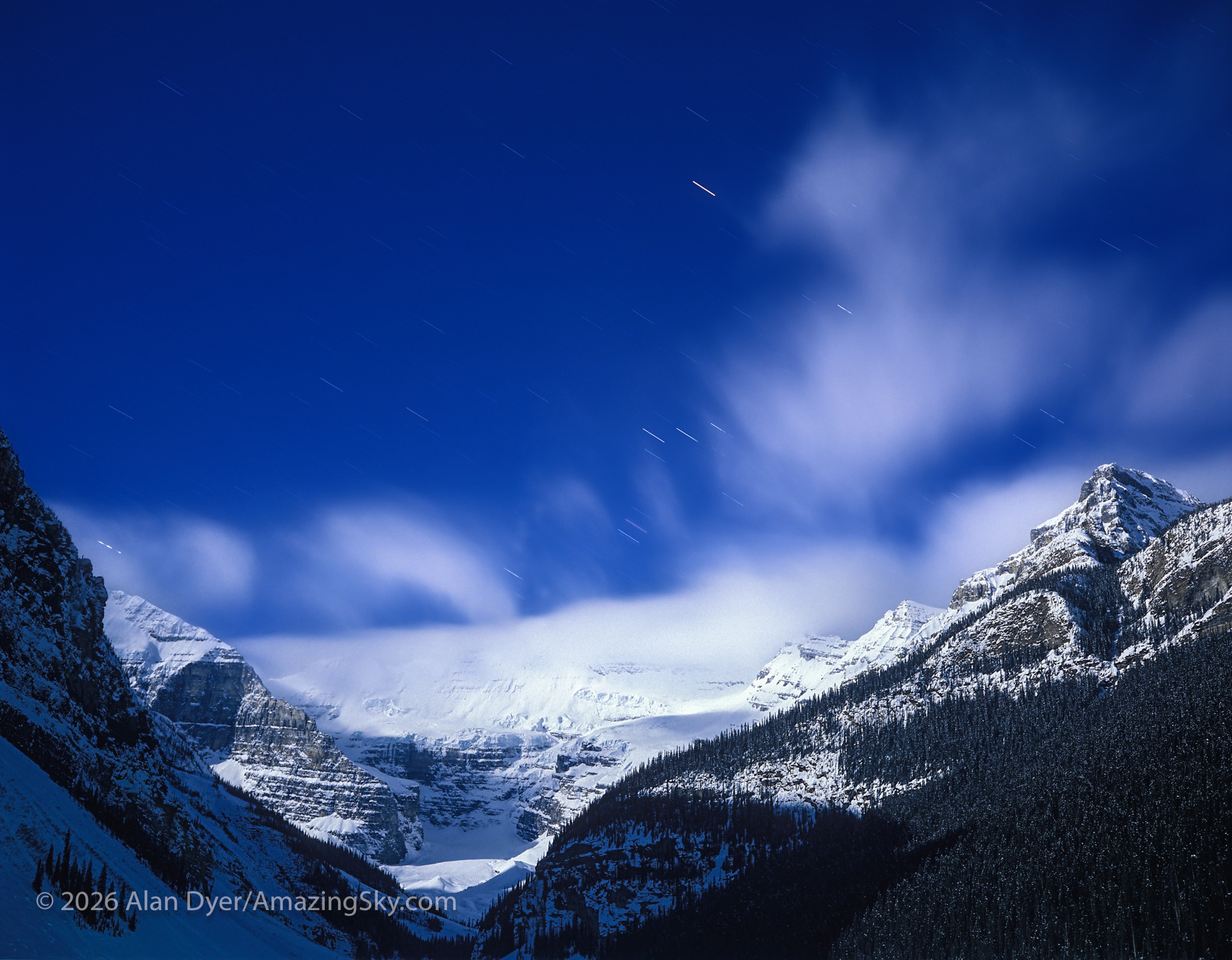 So instead I generally sought out sites in the scenic Canadian Rockies to shoot long exposures by moonlight, as I am doing above at Peyto Lake, to create star trail nightscapes. Exposures were typically 15 to 30 minutes but on slow film. That’s one single exposure on one piece of film. Stacking short exposures? Not in the good old days!