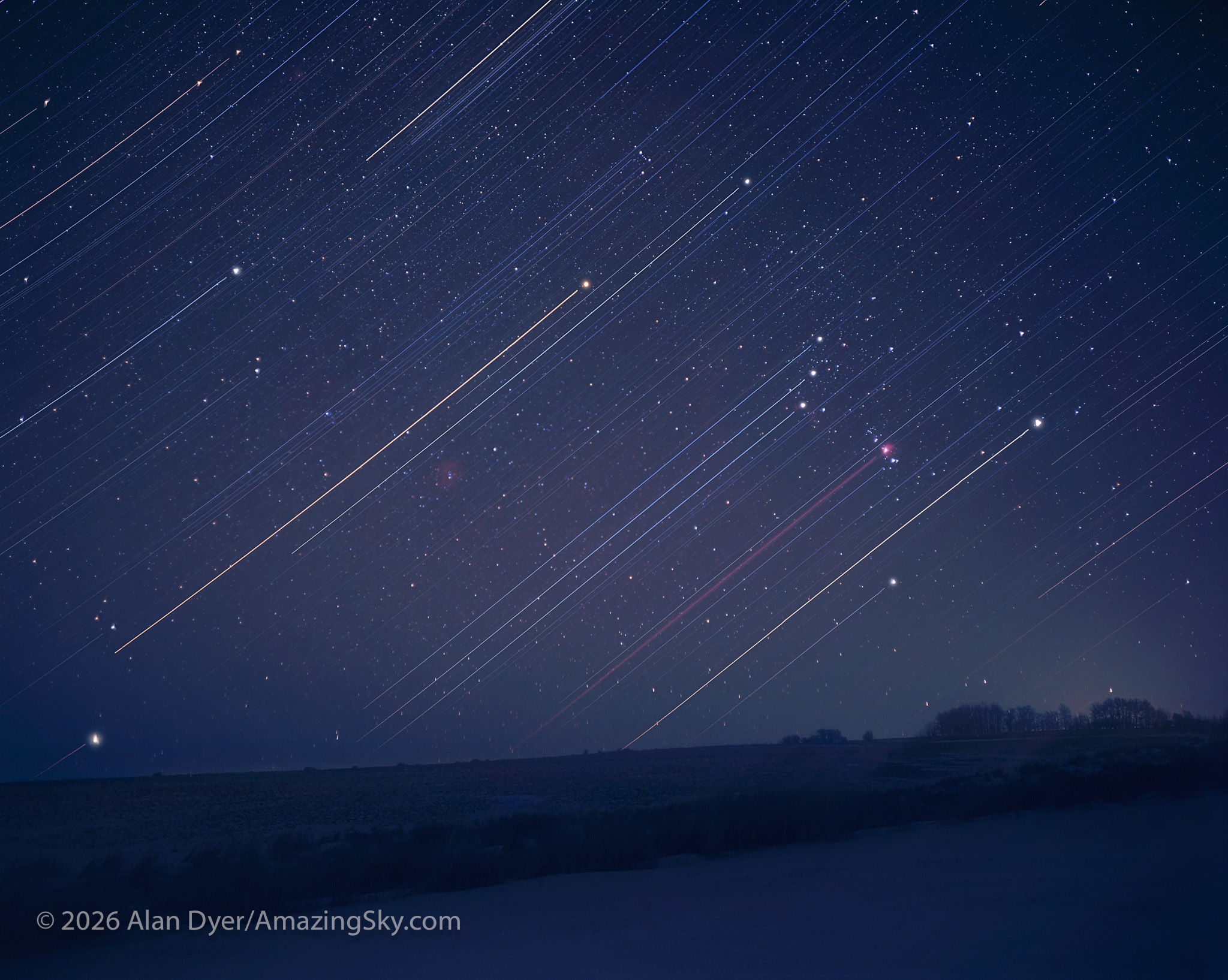 - an untracked exposure for just over an hour as Orion rose into position with lens stopped down to f/8,