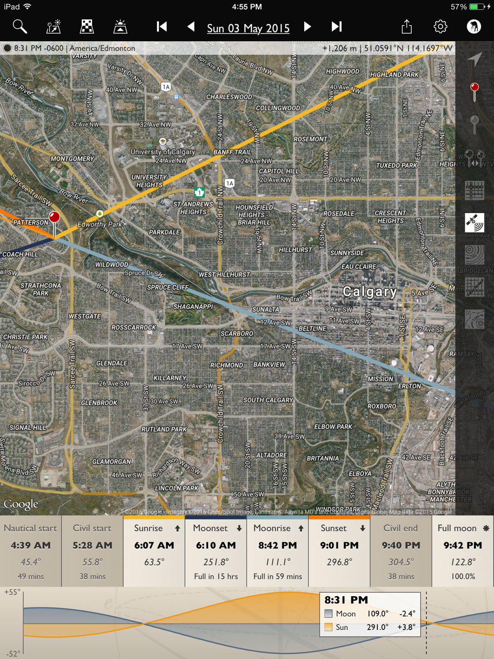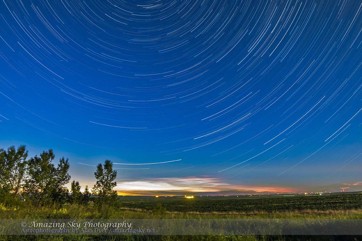 As the NLCs faded, the auroral arc brightened, promising a good show, in line with the predictions (which don’t always come true!). The main aurora reached a peak in activity about 11:30 pm MDT, when it was bright and moving along the northern and northeastern horizon. It then subsided in brightness and structure, giving the impression the show was over.