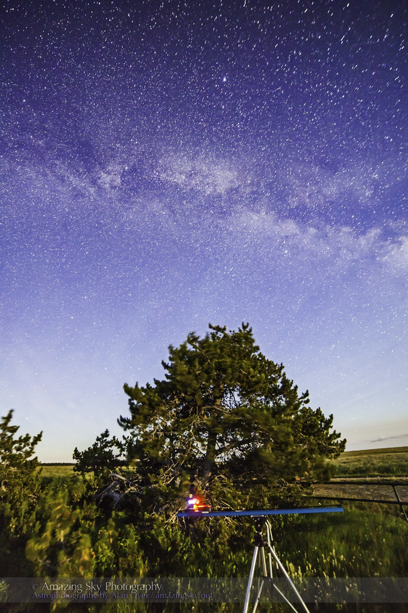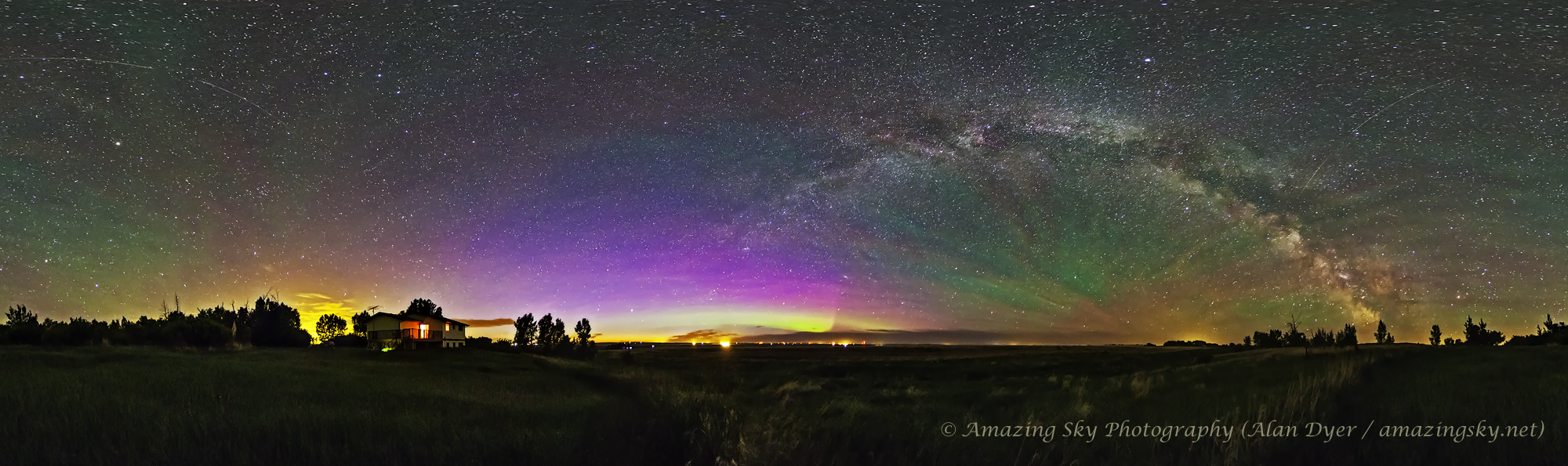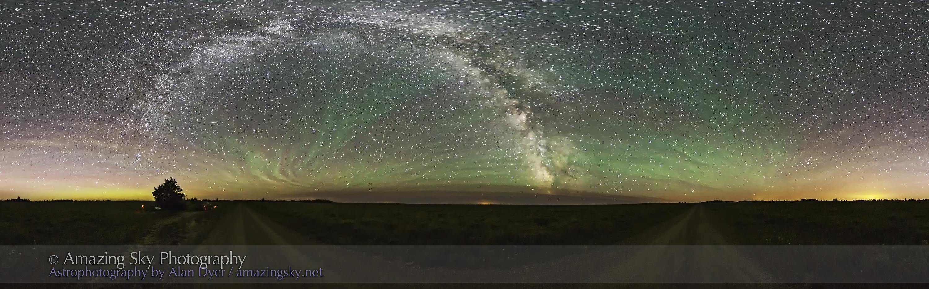 I captured the above panoramas of the aurora early in the night, when we also were treated to a late season display of noctilucent clouds low in the north. These are high altitude water-vapour clouds up almost as high as the aurora. They are common in June and July from here (we are also in an ideal latitude for seeing them). But early August was the latest I had ever sighted NLCs.