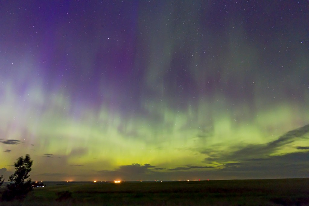 While the display was certainly active and extensive it never did get really bright. So this one still falls short of the “10 out 10” scale for spectacle. Nevertheless, as digital cameras can do so well, the images picked up the greens from glowing oxygen with remarkable intensity. More interesting are the purples, seen toward the beginning of the night but then they faded away. The purple tints come from the tops of the towering curtains of aurora which often glow red from nitrogen molecules at very high altitudes being charged up and excited. But the tops of the curtains can also be lit by sunlight. The blue from the sunlight and the red from the aurora itself mix to produce a purple tint. Only the camera picked this up.