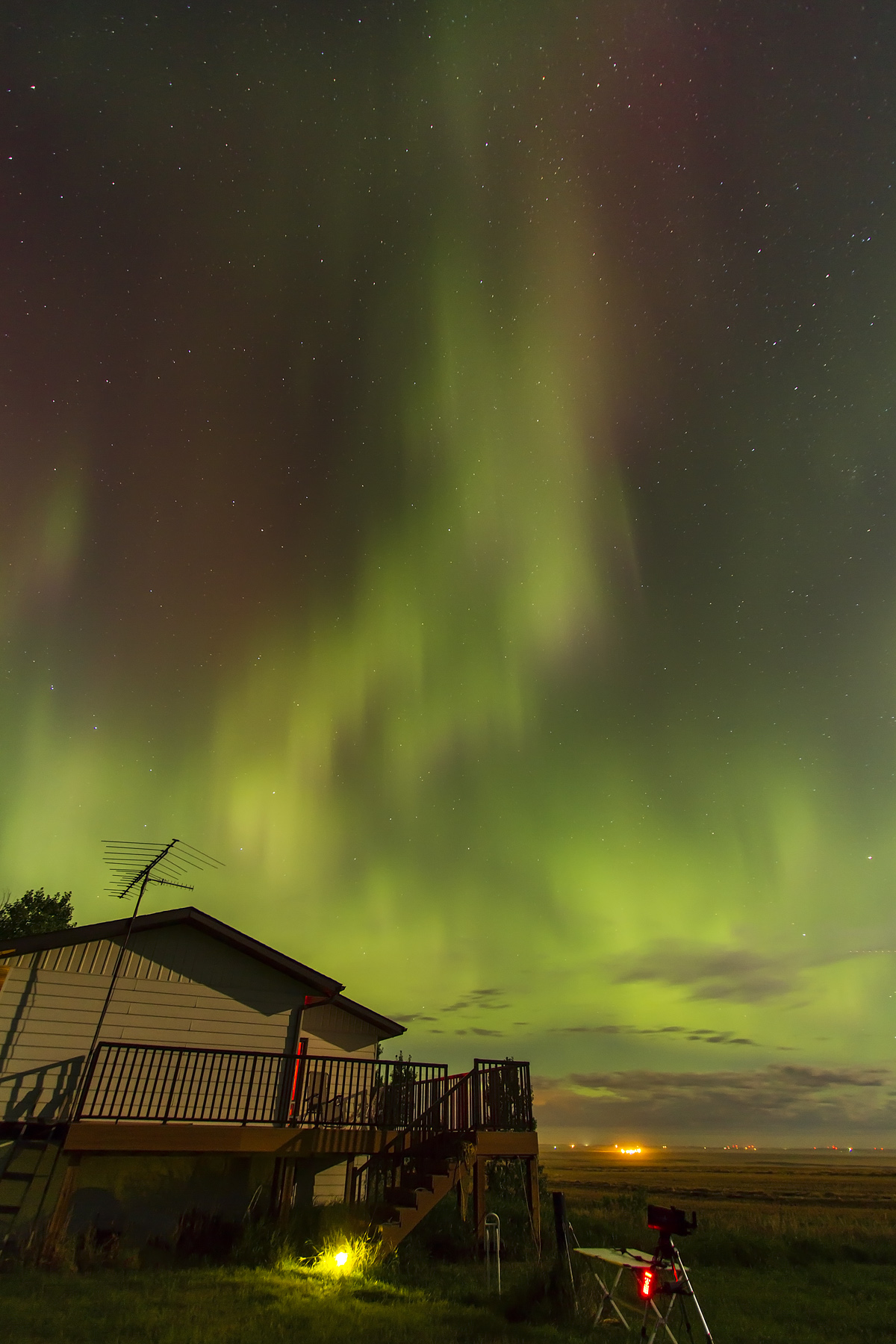 The still frame above is from the movie down below, a 3-hour-long time-lapse taken on May 17, the night of the big aurora display. I shot this with a camera riding along on a motorized dolly track, to provide the panning motion to the scene.