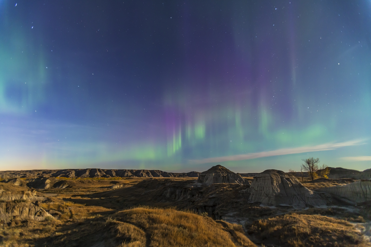 The Big Dipper swings low over the Badlands of Dinosaur Provincial Park, with an aurora added for good measure.