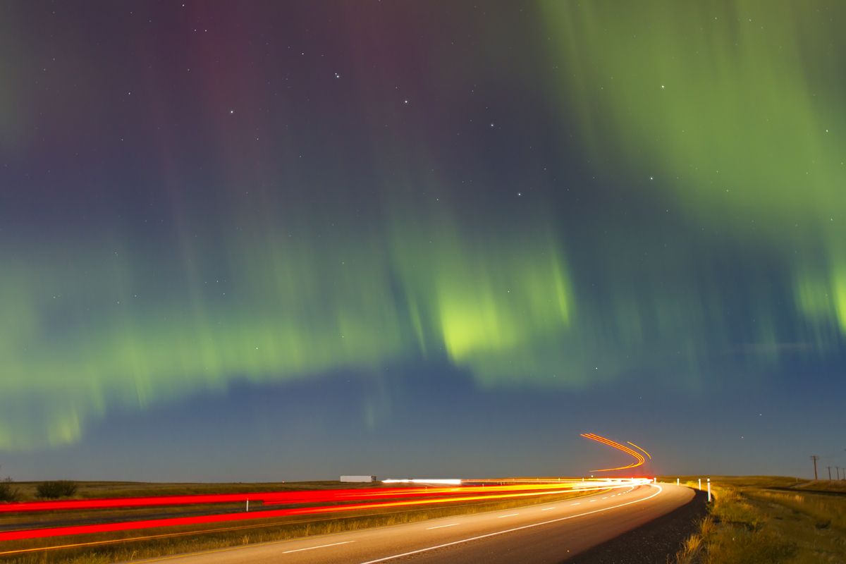Traffic seems to drive off into the Northern Lights, on a highway to heaven.