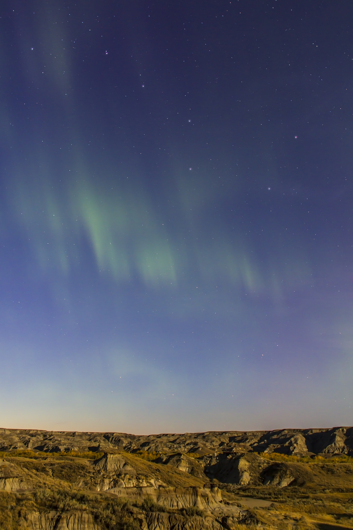 It was a 40-gigabyte night, as the second camera was shooting the moonrise over the badlands. But then I pressed it into service as well shooting the aurora. It was a great night to be at a location as wonderful as Dinosaur Park.