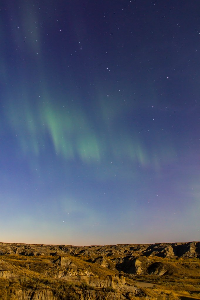 This another shot from my very productive night last Sunday out at Dinosaur Park, 100 km east of me. Here the curtains of aurora that made the news that evening shimmer below the iconic seven stars of the Big Dipper, now low in the northern sky on autumn evenings.